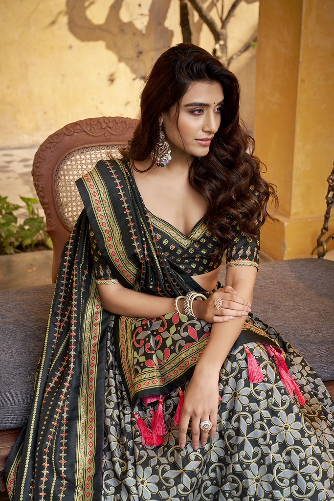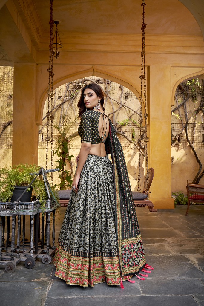 Experience timeless grandeur with RegalTasar Traditions, crafted from luxurious Tasar silk in rich black, green, orange, and purple hues. Featuring heavy traditional detailing, natural silk texture, and elegant flares, this lehenga choli collection is perfect for weddings, festive occasions, and cultural celebrations, offering a regal blend of heritage craftsmanship and refined elegance.