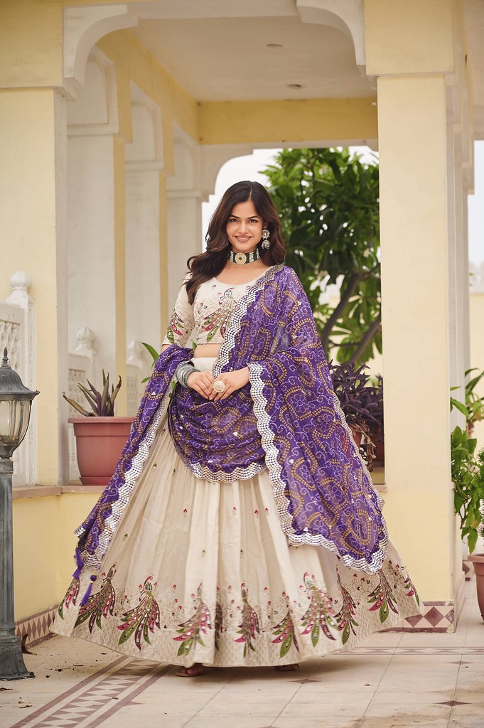 Grace meets grandeur in the Shubhra Collection, crafted in luxurious Pure Tissue Silk and delicate Vichitra work. Designed in a pristine cream palette, this lehenga choli ensemble is perfect for traditional functions, weddings, and festive occasions. Explore elegance in every thread with this lightweight yet royal outfit.