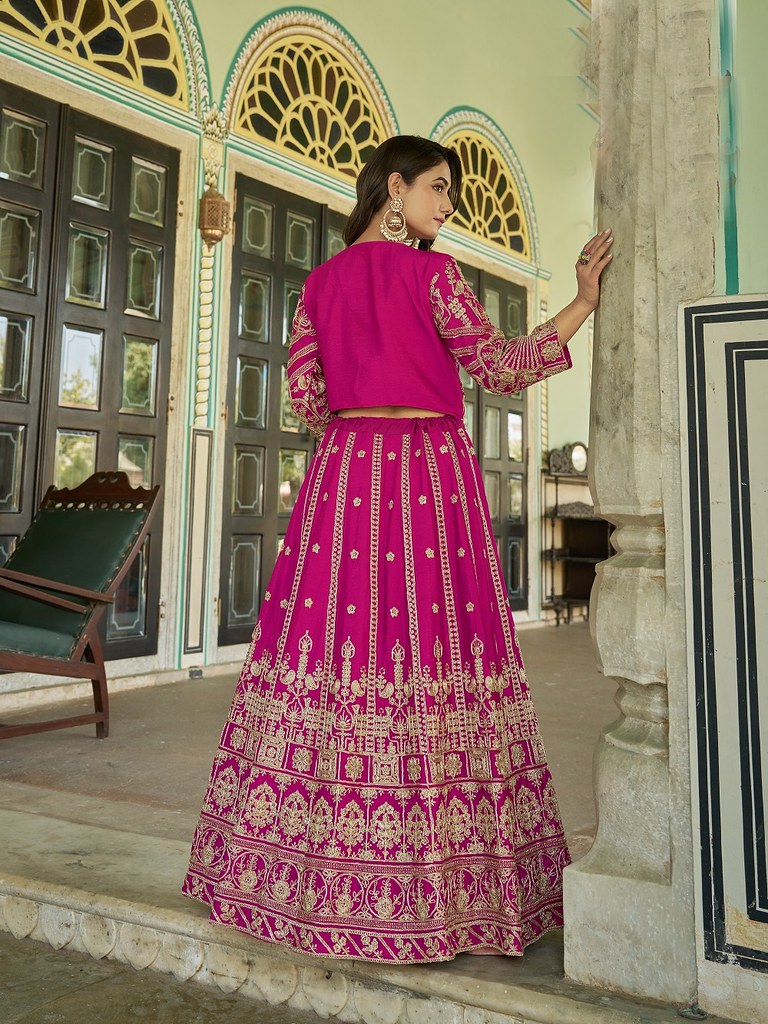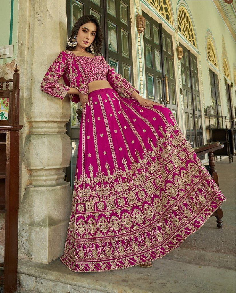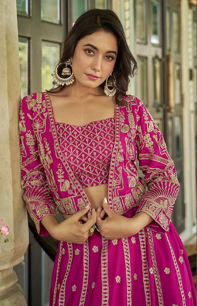 Varnika Collection – A regal blend of tradition and elegance, this Heavy Designer Lehenga, Top & Koti set in luxurious Chinon fabric celebrates the festive hues of Pink and Orange. Crafted with intricate detailing and a touch of grandeur, it embodies the essence of timeless beauty, making it a perfect choice for Navratri and special occasions.