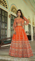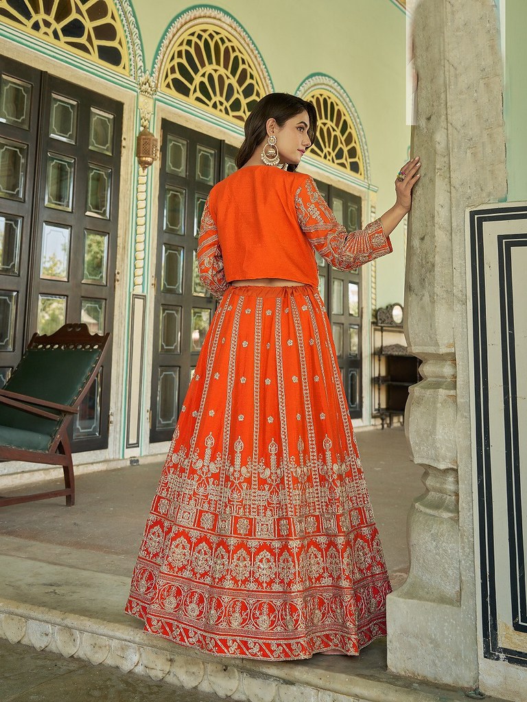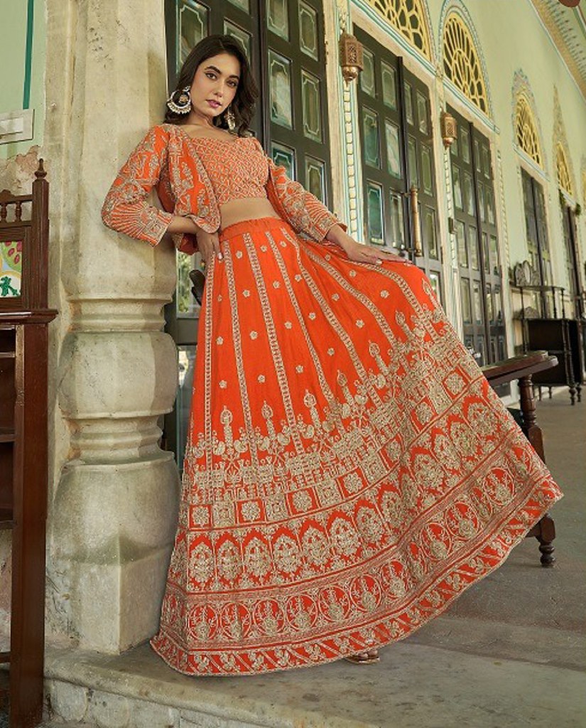Varnika Collection – A regal blend of tradition and elegance, this Heavy Designer Lehenga, Top & Koti set in luxurious Chinon fabric celebrates the festive hues of Pink and Orange. Crafted with intricate detailing and a touch of grandeur, it embodies the essence of timeless beauty, making it a perfect choice for Navratri and special occasions.